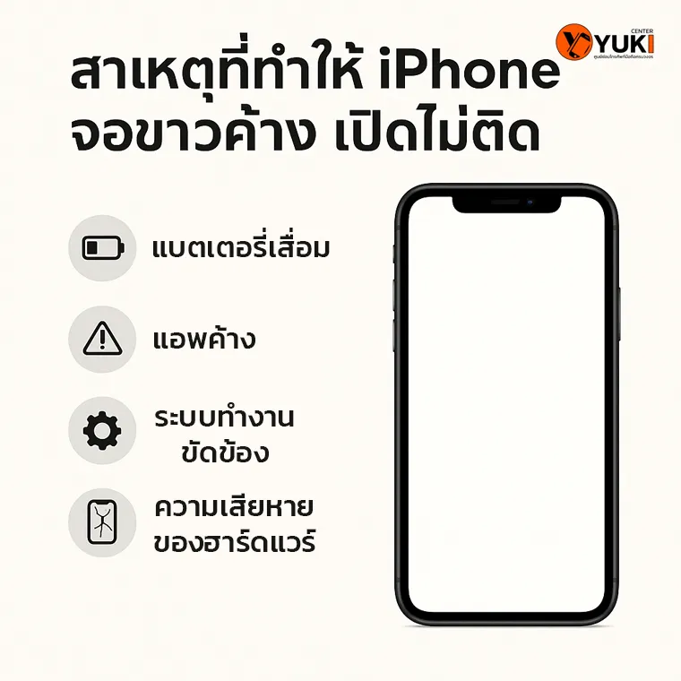 ปัญหา iPhone จอขาวค้าง เปิดไม่ติด ไม่ได้หมายความว่าเครื่องเสียหนักเสมอไป บางครั้งอาจแก้ได้ด้วยวิธีง่าย ๆ เช่น Force Restart หรือชาร์จแบตด้วยสายแท้ แต่หากลองแล้วไม่สำเร็จ การนำเครื่องเข้าศูนย์ซ่อมที่เชื่อถือได้อย่าง Yuki Center คือทางเลือกที่ดีที่สุด เพราะมีทีมช่างผู้เชี่ยวชาญ และอะไหล่คุณภาพที่พร้อมให้บริการ