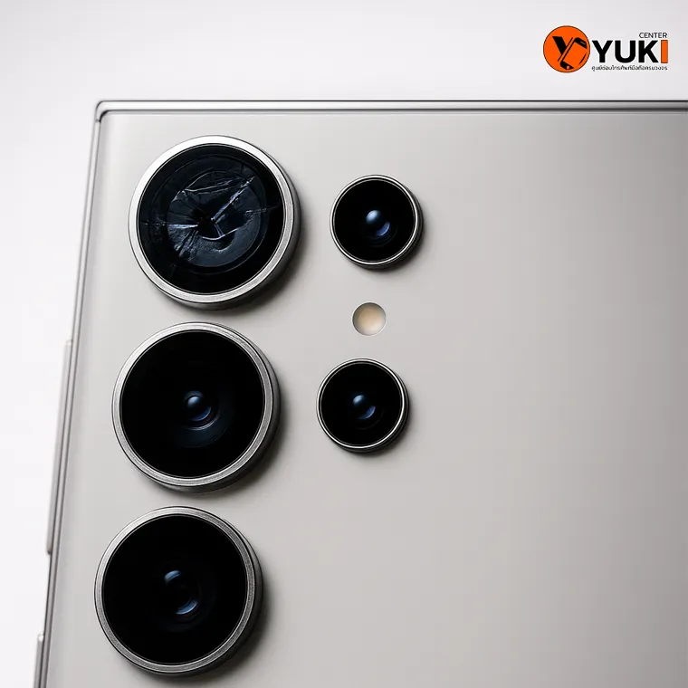 ถึงแม้ Samsung จะออกแบบระบบกันสั่น (OIS) และฝาหลังที่ใช้กระจกกันรอย แต่จากประสบการณ์ร้านซ่อมแทบทุกที่ รวมถึงช่างเทคนิคของ Yuki Center พบว่า กล้องหลัง ซัมซุง S24 Ultra มีความละเอียดสูงและมีโครงสร้างเลนส์หลายชุด ทำให้เกิดอาการเสียได้มากกว่ามือถือทั่วไป เช่น โมดูลซูม 5X/10X ทำงานหนักกว่า และตัวกันสั่นมักมีปัญหาเมื่อได้รับแรงสั่นแรง ๆ